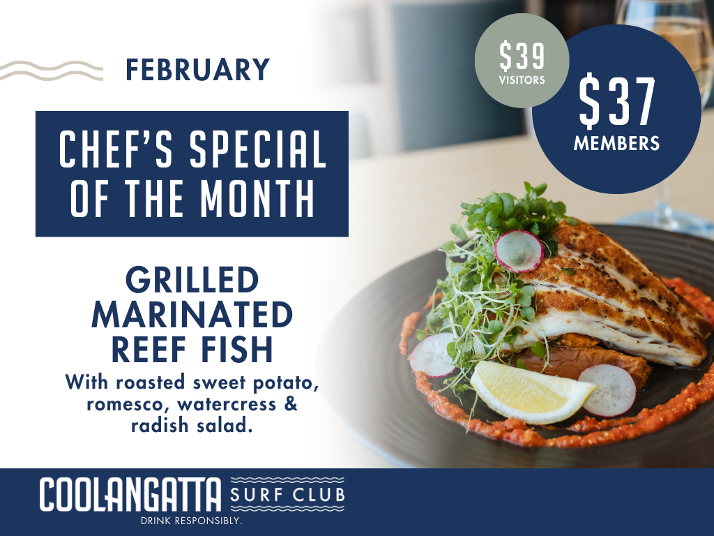 Category Monthly Specials Date 01 Feb 2026 Time All Day Chef’s Special – Grilled Marinated Reef Fish With Roasted Sweet Potato, Romesco, Watercress & Radish Salad. $25 (M) | $27 (V) Share this event