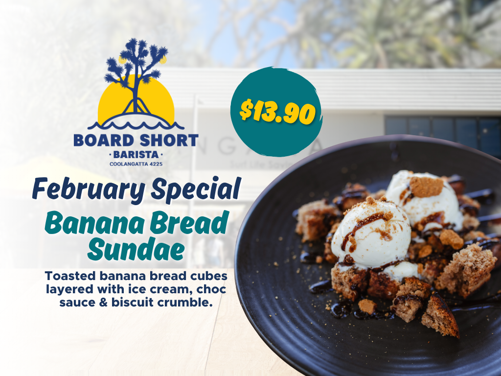 Category Board Short Barista Date 01 Feb 2026 Time All Day February Special BSB – Banana Bread Sundae Toasted banana bread cubes layered with ice cream, choc sauce & biscuit crumble. $13.90 Share this event
